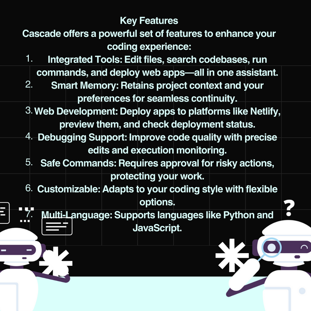 Unlock your coding potential with the Windsurf inspired AI assistant, the ultimate AI-powered coding assistant designed to supercharge your development workflow! Windsurf saves you hours by automating complex tasks, debugging with precision, and generating production-ready code. Whether you’re building an app, fixing bugs, or deploying a web project, Cascade delivers clean, optimized solutions tailored to your needs. With its smart memory system, it learns your preferences and project context, making every task faster and smarter. Boost productivity, enhance code quality, and ship projects with confidence—Cascade is your go-to coding partner!